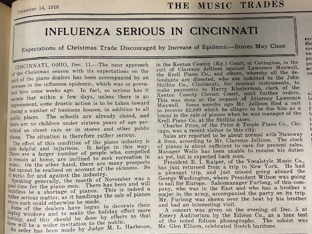 One newly rediscovered collection within these prestigious archives is a collection of articles from The Music Trades that document the 1918 influenza pandemic that swept the world.